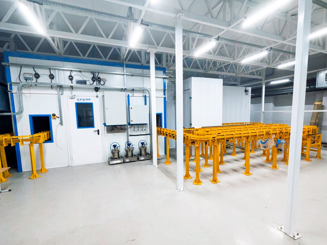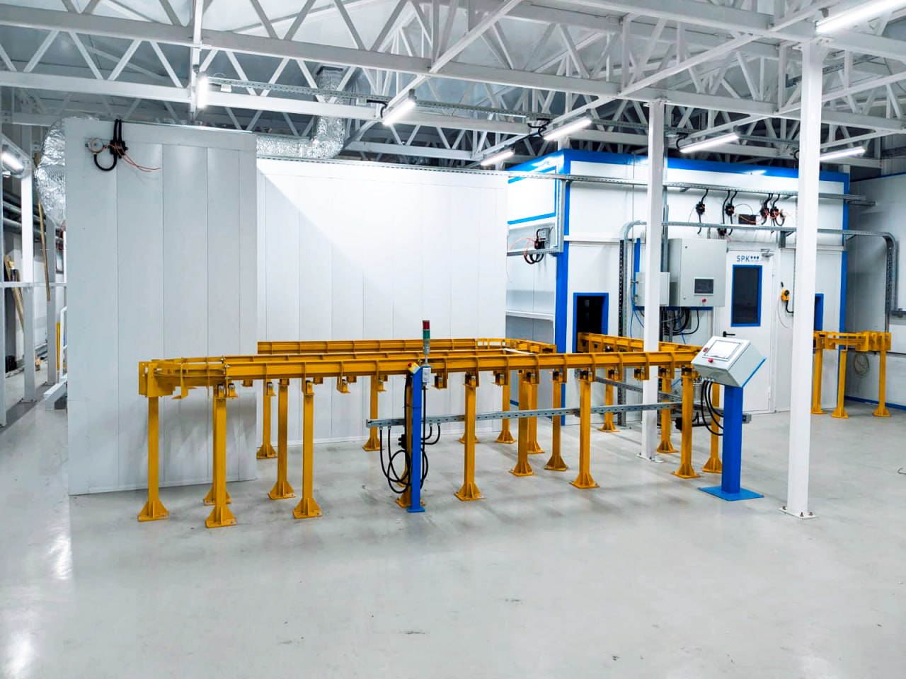 Окрасочно-сушильная камера представляет собой проходную двухсекционную конструкцию, размещенную внутри камеры подготовки SPK-PB-14.11.3/1004/2023. Загрузка и выгрузка изделий осуществляется на напольном цепном конвейере.